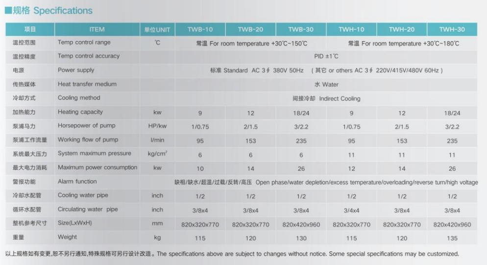 應用范圍:射出成型模具控溫、押出成型、輥輪加溫、橡膠機械溫度控制、導光板、光學鏡頭、光碟、連接器之射出成型